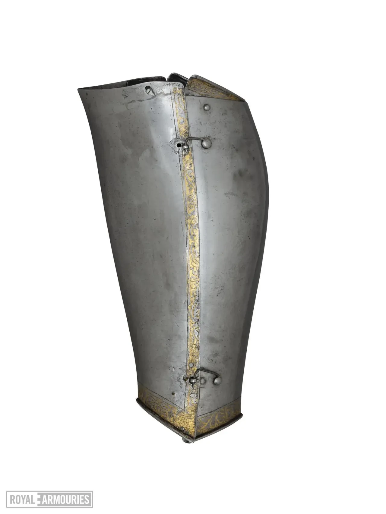 Наплечники состоят из пяти пластин, правый наплечник уменьшен спереди для удобства удержания копья. Набедренники выполнены из двух частей, соединенных скользящими заклепками, что позволяет им сдвигаться относительно друг друга. Наплечники гринвичской конструкции состоят из больших пластин, которые полностью охватывают внутренний сгиб локтя. Перчатки типа «варежка», манжеты которых открываются на шарнирах. Наколенники имеют большие веерообразные «раковины», имеющие форму «сердца». Наголенники заканчиваются у лодыжки и имеют окантовку, позволяющую надевать их поверх сабатонов, которые сейчас отсутствуют.