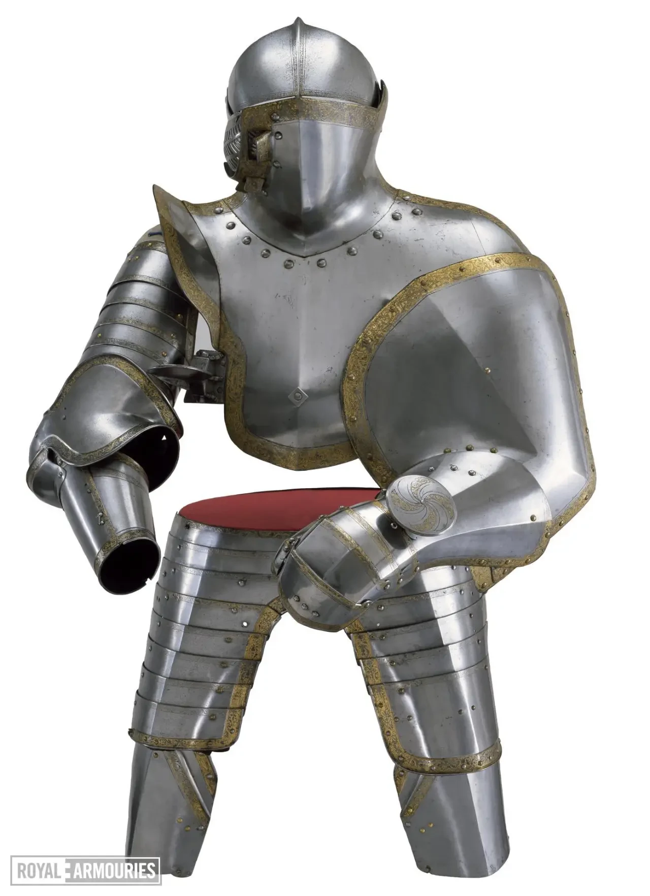 Поверхность всех доспехов изначально была посеребрена и позолочена, а основа гравюры была заштрихована для ее сохранения; в нескольких местах серебро сохранилось. Край «юбки» украшают позолоченные буквы «Г» и «К» — Генрих и Екатерина, то есть в этих доспехах Генрих VIII, видимо, должен был красоваться на своей свадьбе с Екатериной Арагонской! А вот и размеры деталей этого доспеха: высота кирасы 356,0 мм, ширина кирасы 324,0 мм, высота шлема 298,0 мм, ширина шлема 190,5 мм, вес шлема 3,215 кг. Общий вес 30,113 кг.