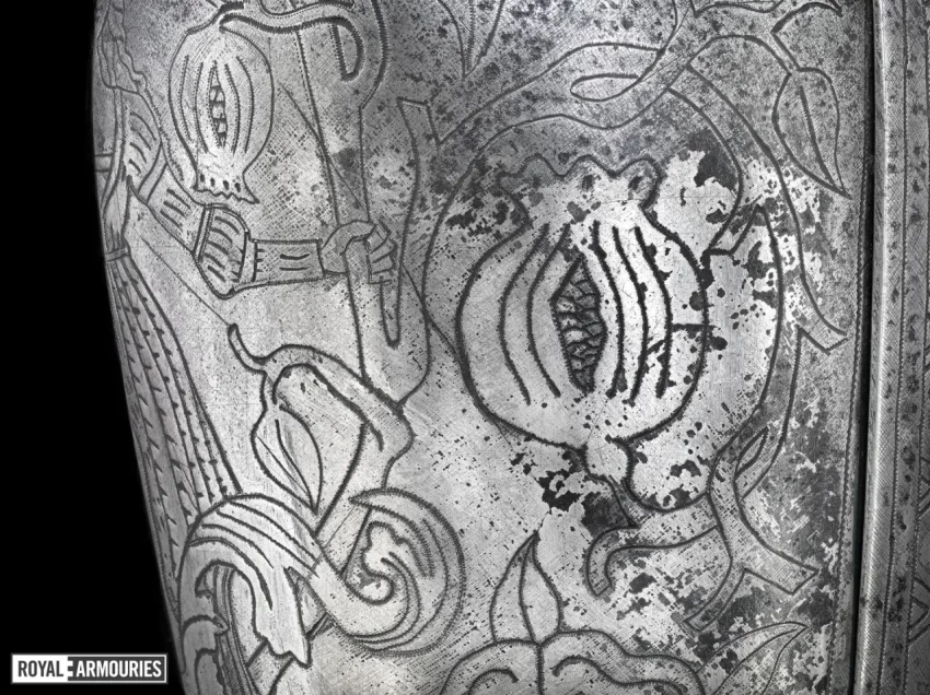 Поверхность доспехов украшена сплошной гравировкой с изображением плодов граната…