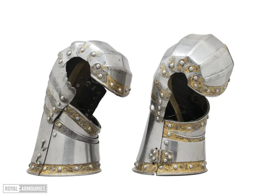 Наколенники с изображением на пластинах «раковин» пучка стрел Арагона и объединенного герба Тюдоров и Екатерины Арагонской – половинки розы и цветка граната