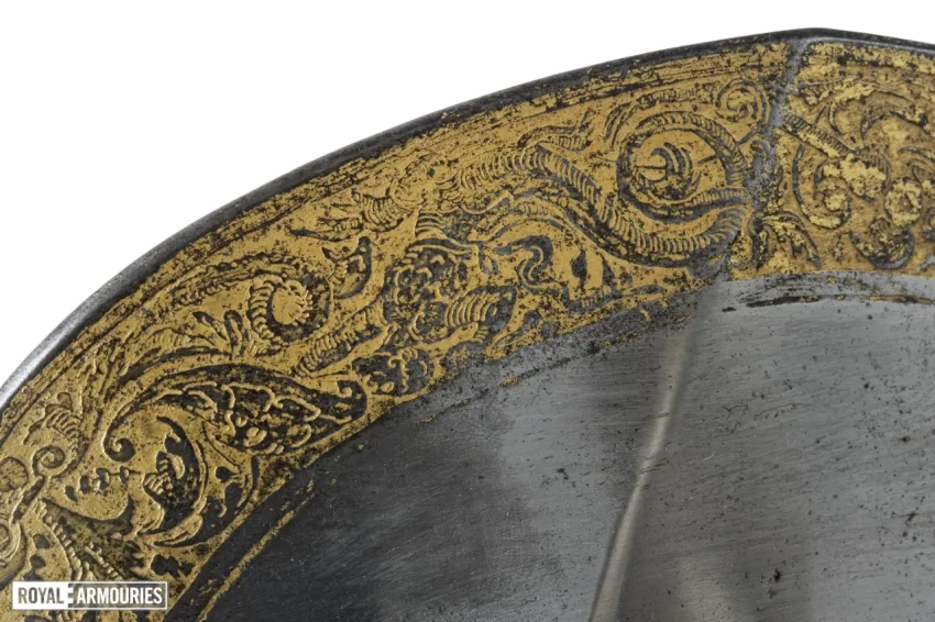 Шлем этих доспехов имел невысокий килевидный гребень. В задней части шлема есть отверстие для ножки отсутствующего ронделя – металлического кружка. Такие «кружки» на затылочной части были характерны для шлемов армете XV–XVI вв. Зачем они были нужны? Функций у этой детали было сразу несколько: диск ронделя прикрывал кожаный ремешок, удерживающий подбородник, предохраняя его от перерубания мечом или каким-то другим оружием, усиливал защиту затылка, так как создавал еще одну преграду для ударов, направленных в уязвимую зону шлема сзади. Ну и декоративную функцию ронделя тоже никто не отменял, ведь их, как и прочие части доспеха, украшали гравировкой, насечкой или позолотой, чем лишний раз подчеркивали статус обладателя и ронделя, и шлема!