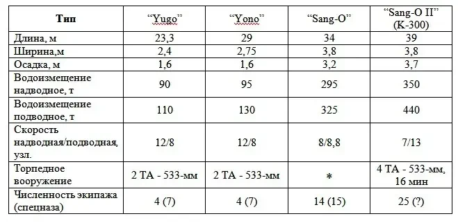 Ниже приводятся ориентировочные ТТХ сверхмалых ПЛ флота КНДР, хотя эти сведения в иностранных источниках крайне противоречивы и не внушают особого доверия.
