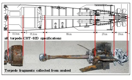 В качестве доказательства Южная Корея приводила будто бы найденную 15 мая в районе гибели «Чхонана» кормовую часть торпеды с винтами, двигателем и рулевым устройством. Сеул утверждал, что эти части полностью соответствуют схематическому чертежу торпеды северокорейского производства типа CHT-02D (калибр 533 мм, длина 7,35 м, вес 1,7 т, вес боевой части 250 кг, системы наведения – пассивная акустическая и по кильватерному следу), приведенному в рекламном буклете северокорейского Военэкспорта. Фигурировал также серийный номер, нанесенный корейским шрифтом. Однако, хотя эти части торпеды пробыли на морском дне всего лишь около полутора месяцев, они сильно корродированы, что вызывает сомнения в их происхождении.