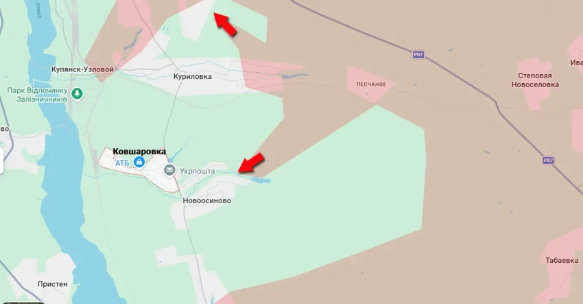 Одновременно с этим фиксируется продвижение Вооружённых сил России в районе Куриловки. Это восточный пригород всё того же Купянска-Узлового.