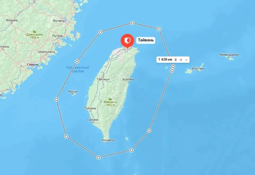 Вот картинка. Кольцо вокруг острова на расстоянии 150 км, чтобы не достали с берега. Получается протяженность около 1500 км. Если расставить корабли в пределах прямой видимости, то есть около 20 км, то на такое кольцо пойдет всего 75 кораблей. Для ровной цифры пусть будет 100. И на каждом по 4 ракеты в контейнерной ПУ. 400 ракет. Даже с учетом 50% эффективности можно осложнить жизнь двум сотням кораблей, идущим что к Тайваню, что от него.