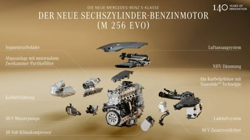Рядные шестицилиндровые бензиновые моторы S 450 и S 500 (M256 Evo) получили более мощный электрический бустер-турбонагнетатель (система eBooster/48 V mild hybrid), который в нижнем диапазоне оборотов помогает турбине и практически полностью устраняет турбояму, особенно при обгонах или спонтанном ускорении.
