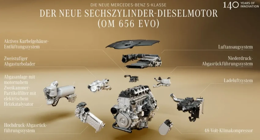 Рядный шестицилиндровый дизельный двигатель OM 656 Evo, используемый в S 350D 4MATIC и S 450D 4MATIC, оснащён переработанной и улучшенной системой охлаждения, что повышает его надёжность и динамичность работы.