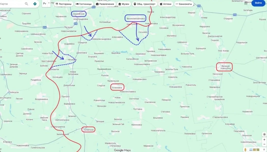 Украинские войска, опираясь на Покровское и Великомихайловку, наступают по сути в тыл группировки "Восток" и пока наибольших успехов противник достиг в районе населённого пункта Новомихайловка, где смог отбросить наши передовые заслоны в районе Орестополя и Сосновки и в настоящее время пытается зайти в населённый пункт Берёзовое.