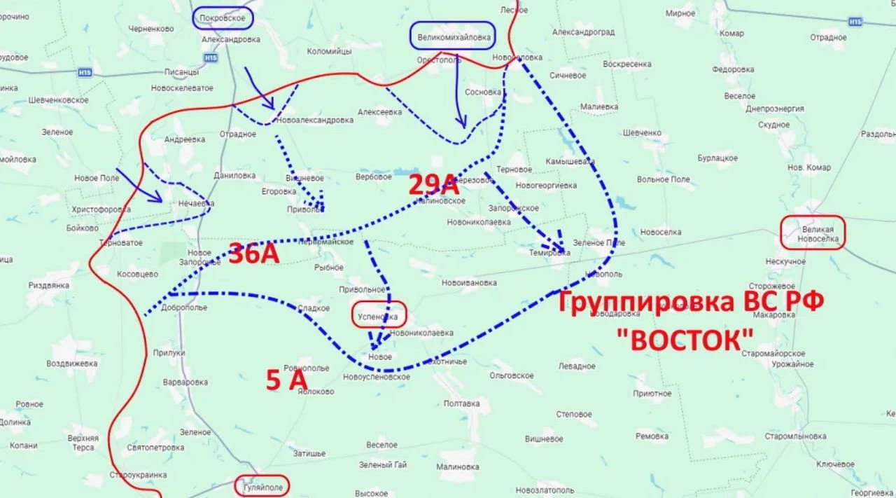 Он считает, что противник использовал серьезную застройку в Великомихайловке и пгт Покровское для накопления там основных сил и нанесения оттуда рассекающего удара по 29-й армии, а также по правому флангу 36-й армии России. После этого враг рассчитывает выйти на линию Зелёное Поле - Успеновка и зайти в тыл основным частям 36-й армии и 5-й армии.