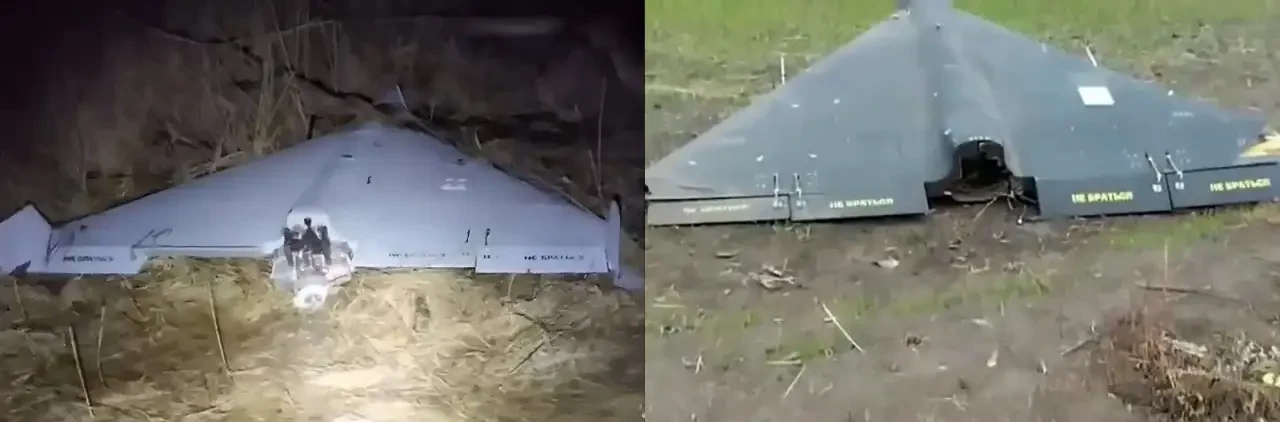 БПЛА семейства «Герань» вооружённый ПЗРК (слева) и обломки БПЛА семейства «Герань» с ракетой «воздух-воздух» Р-60
