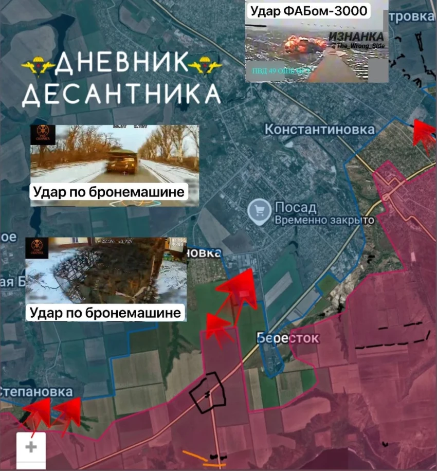 На Константиновском участке ВКС РФ применили сверхмощные авиабомбы ФАБ-3000, уничтожив несколько стратегически важных мостов в самой Константиновке, что нарушает снабжение гарнизона.
