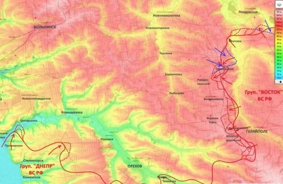 По его оценке, потеря этих населённых пунктов может осложнить положение украинских подразделений и вынудить их отойти на новые оборонительные рубежи. Одновременно продолжаются боевые действия в районе Гуляйполя и Верхней Терсы.