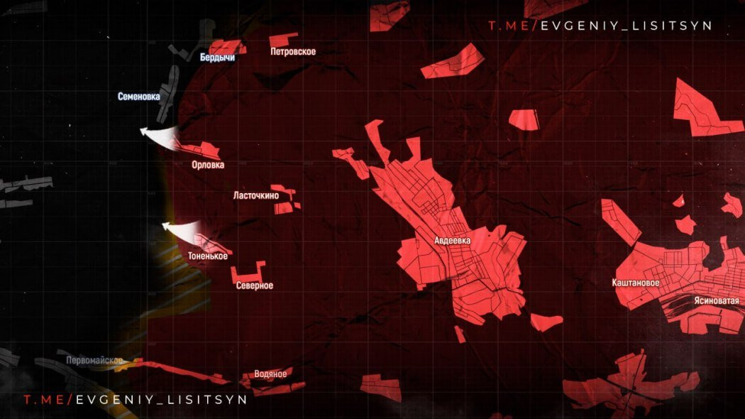 На Донецком направлении к западу от Авдеевки, ВС РФ расширяет зону контроля, в частности, у Тоненького и Орловки. К югу от Марьинки, ВС РФ добились прогресса, в частности, поддавливая противника в Новомихайловке и ведя тяжелые бои в Красногоровке, пишет в своём Telegram-канале военкор Евгений Лисицын.
