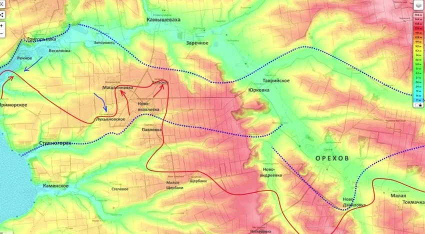 По его словам, штурмовые подразделения стараются сейчас дочистить эти сёла, чтобы полностью их занять, после чего планируется дальнейшее развитие наступления в направлении Юрковки и Камышевахи. Речь идёт о двух основных векторах: продвижении в сторону Запорожья и обходе Орехова с северо-запада.