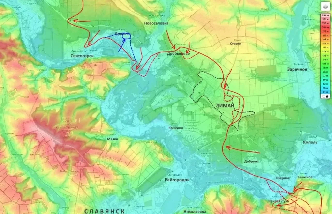Лиманское направление: активная фаза боёв продолжается внутри Лимана и Дробышево. По данным объективного контроля, приведённым Юрием Подолякой, российские бойцы уверенно контролируют северо-восточную часть населённого пункта Святогорск.