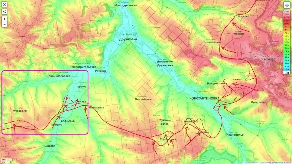 Высокая динамика боевых действий сохраняется на Славянско-Краматорском участке. После успешной зачистки Миньковки и Приволья, Вооружённые силы Российской Федерации (ВС РФ) вышли к руслу канала Северский Донец - Донбасс на новом отрезке, начав спуск в долину к Малиновке и Краматорску.