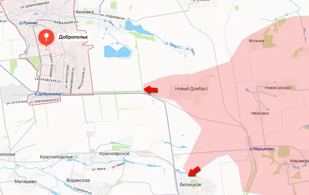 Также российские штурмовые группы при поддержке дроноводов и артиллерии вышли к железной и автомобильной дорогам, которые соединяет Доброполье с городом Белицкое. В такой ситуации беспрепятственный трафик ВСУ между двумя городами перестал быть возможным. Снабжение гарнизона противника в Белицком ведётся теперь главным образом по дороге через Красноподолье и Красноярское, сообщает "Военное обозрение".