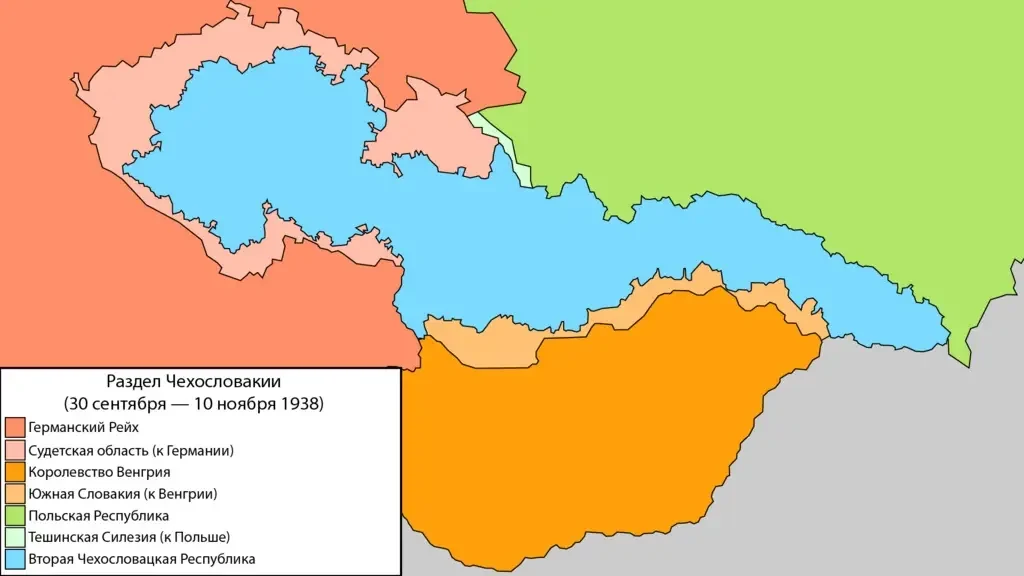 30 сентября 1938 года было подписано Мюнхенское соглашение между Германией, Великобританией, Францией и Италией. Документ подписали также представители Чехословакии. Соглашение предусматривало, что Чехословакия в течение 10 дней передаст Германии Судетскую область. Позднее прекратила свое существование и искусственное творение Сен-Жермена – Чехословакия. Её остатки превратились в Протекторат Богемия и Моравия и «независимую» Словакию. По кусочку откусили Польша и Венгрия.