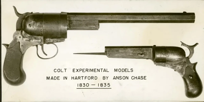 Ранние прототипы, созданные Кольтом. Заметно, почему таки понадобилась помощь профессионального оружейника и почему один из самых ранних прототипов просто взорвался. Технологический уровень изделий крайне низкий, что и не удивительно, денег на нормальные инструменты и оснастку просто не было, да и опыта не доставало. Но родовые черты будущих моделей вполне угадываются