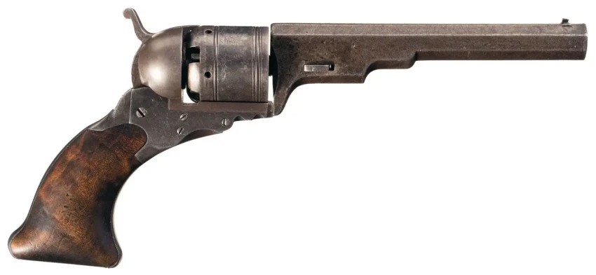 Вот с последними двумя минусами и решил бороться британский изобретатель Элайша Кольер. Он создал так называемую «переходную перечницу». По сути, ещё не револьвер, но уже и не «перечница», а полноразмерный кремнёвый пистолет с полноценным барабаном. Надо сказать, что подобные конструкции существовали и до Кольера, но его конструкции были официально запатентованы и вполне коммерчески успешны. Правда, в остальном это была та же самая «перечница», взведение курка и поворот барабана были процессами, никак не связанными и производились отдельно. Манипуляции с оружием надо было производить строго двумя руками.