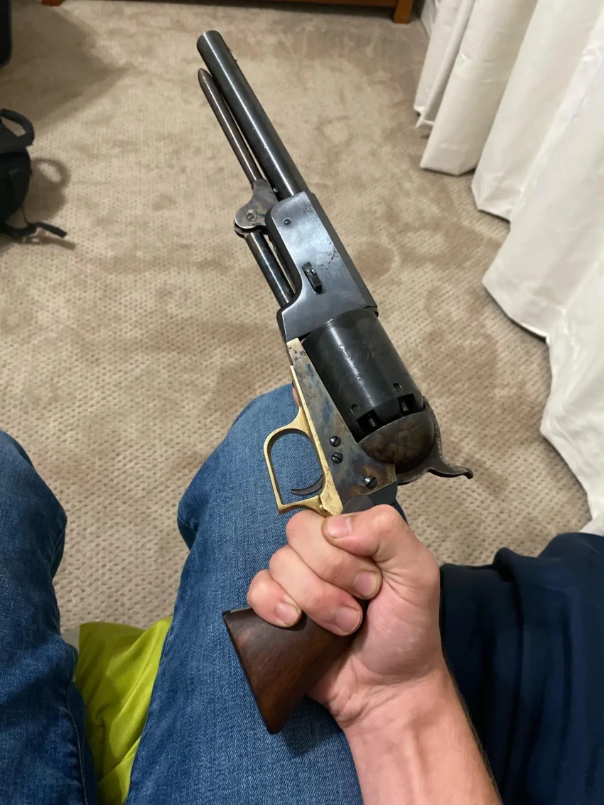 Ну а дальше начинается война с Мексикой, и бывшие техасские рейнджеры, а ныне кавалеристы армии США, решают, что им нужно специализированное оружие для их задач. Хэйс отправляет Уокера на встречу с Кольтом с заданием обсудить выпуск специальной модели револьвера. Так в 1847 году появляются Кольт-Уокер. Револьвер был выпущен партией в 1000 штук, и ещё 100 было сделано для гражданского рынка. Именно эта модель, вкупе с рекламой, которую ему сделали техасцы, и стала началом того самого Кольта.