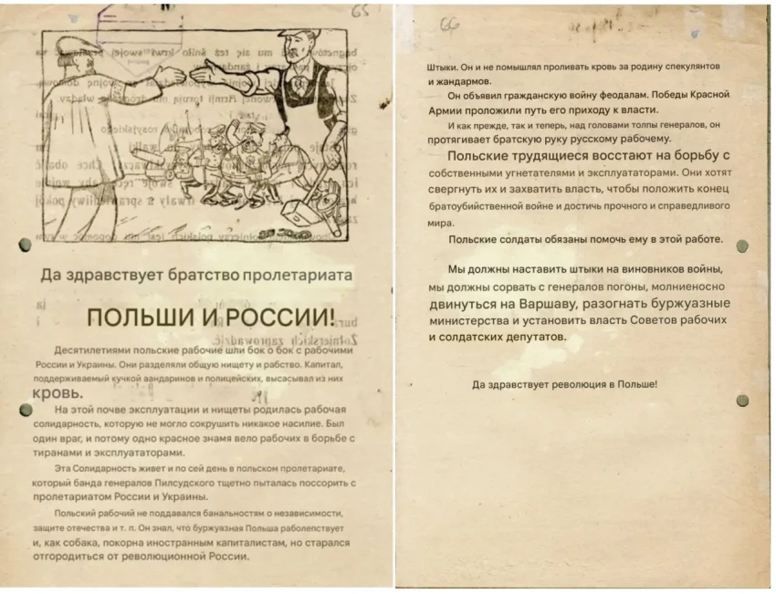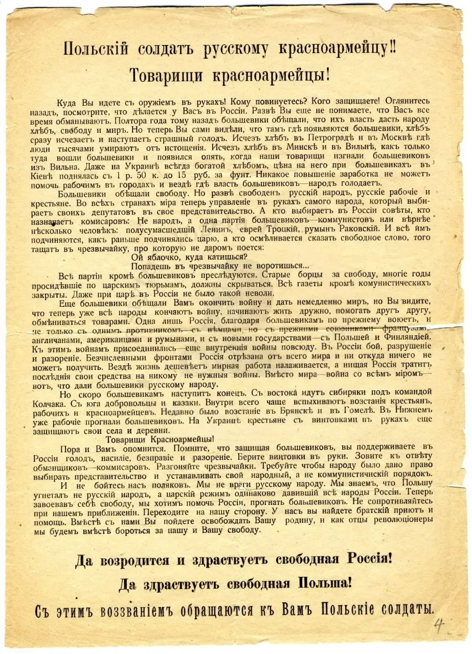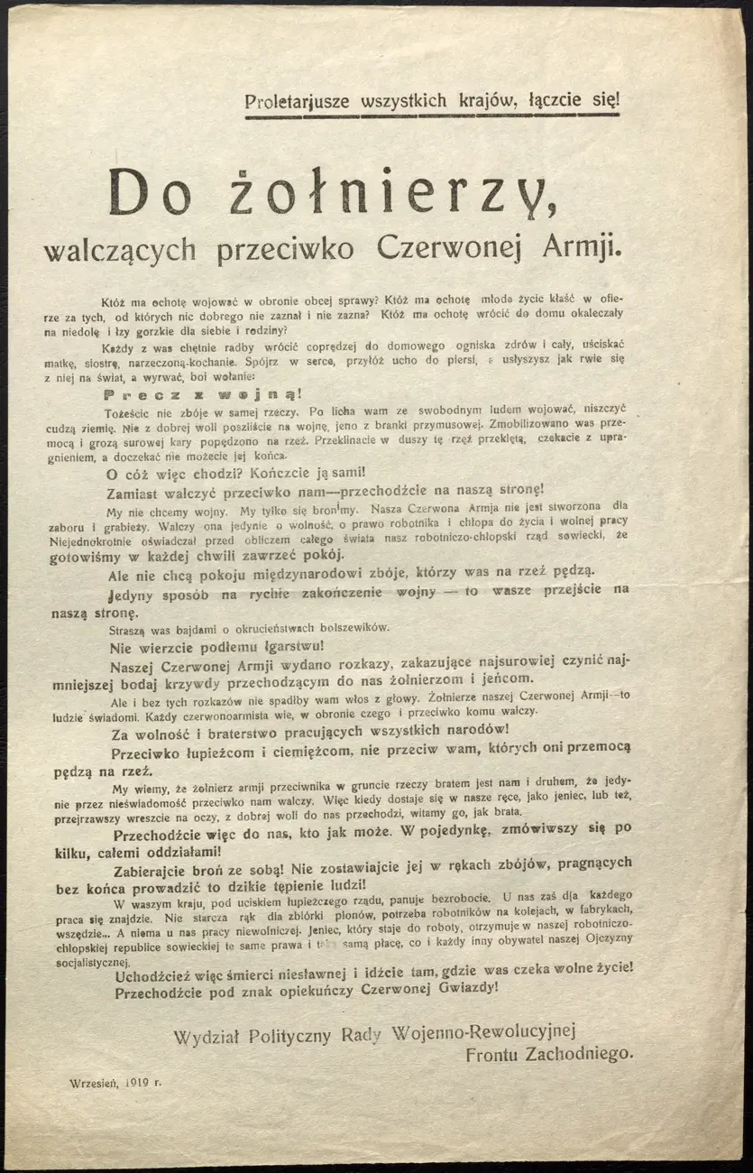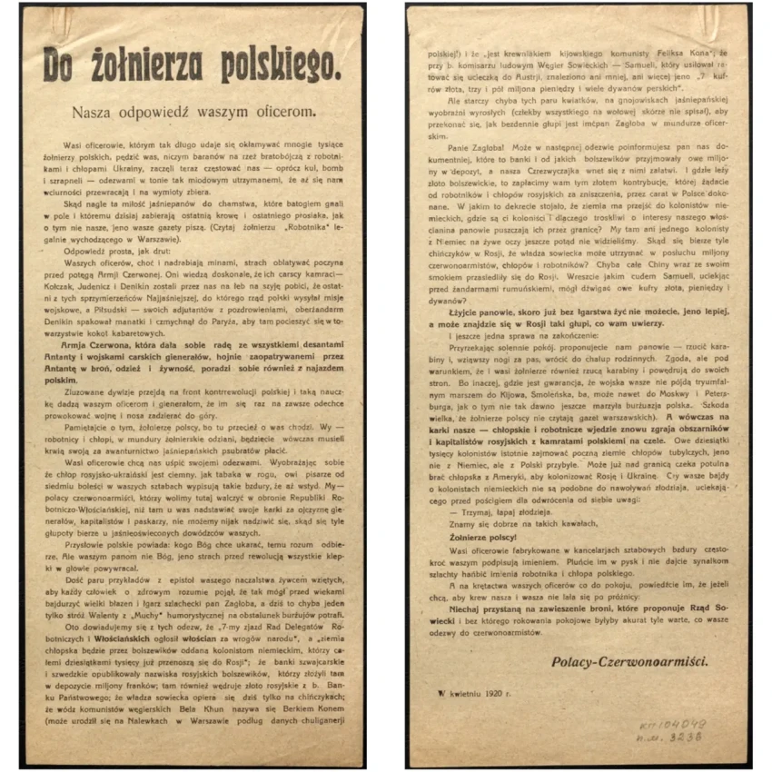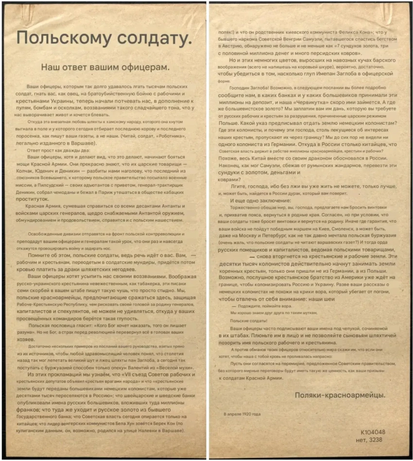 Листовка политотдела РВС Западного фронта с обращением к польским солдатам, воюющим против Красной Армии, не поддаваться антисоветской пропаганде и переходить на сторону красных. Архив РГАСПИ: КП-104049 ПМ-3230.