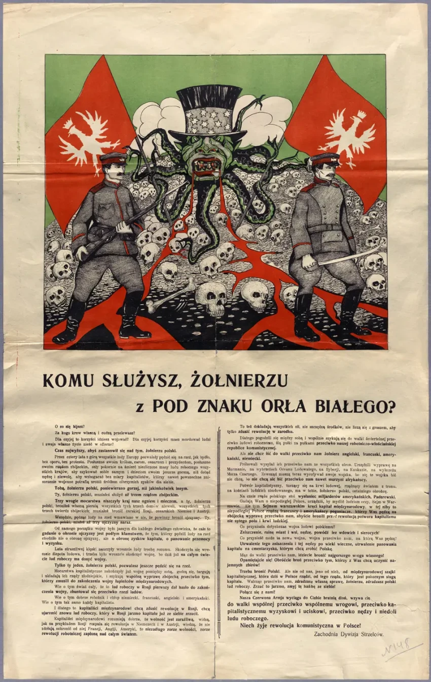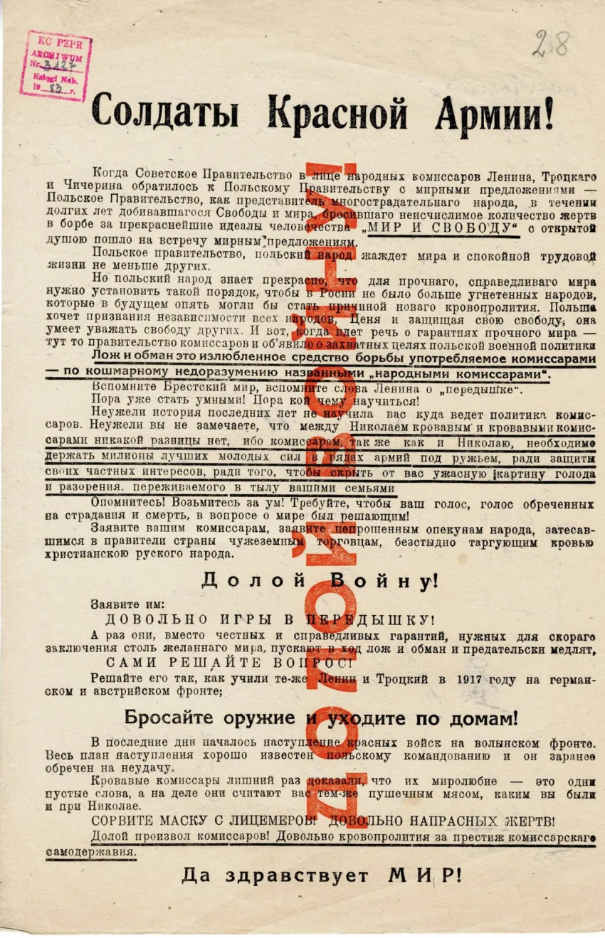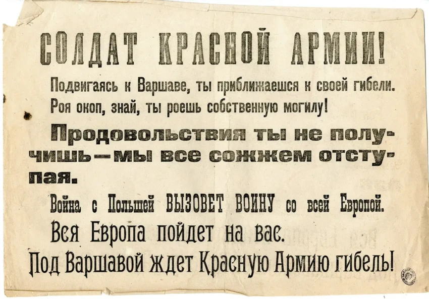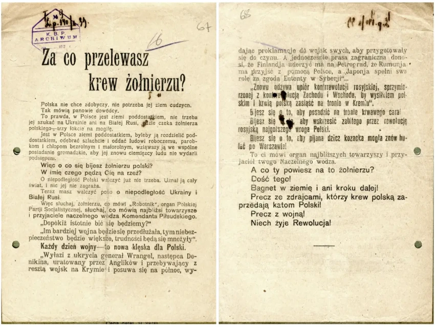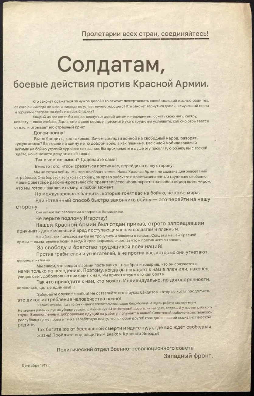 Листовка политотдела РВС Западного фронта с обращением к польским солдатам, воюющим против Красной Армии, не поддаваться антисоветской пропаганде и переходить на сторону красных. Архив РГАСПИ: КП-104049 ПМ-3230.