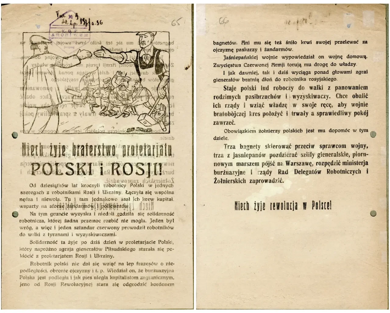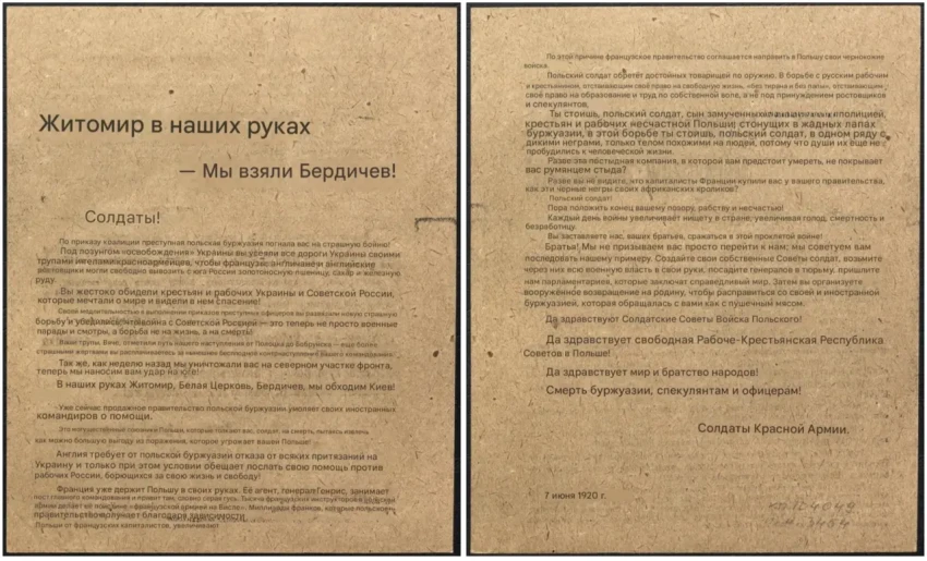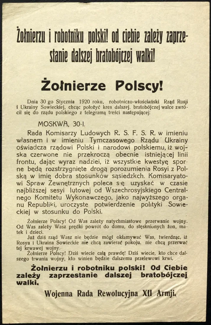 Листовка РВС 12-й армии с обращением к польским солдатам прекратить братоубийственную войну и выдержками из обращения СНК РСФСР к польскому правительству и народу. Архив РГАСПИ: КП-104049 ПМ-3419.