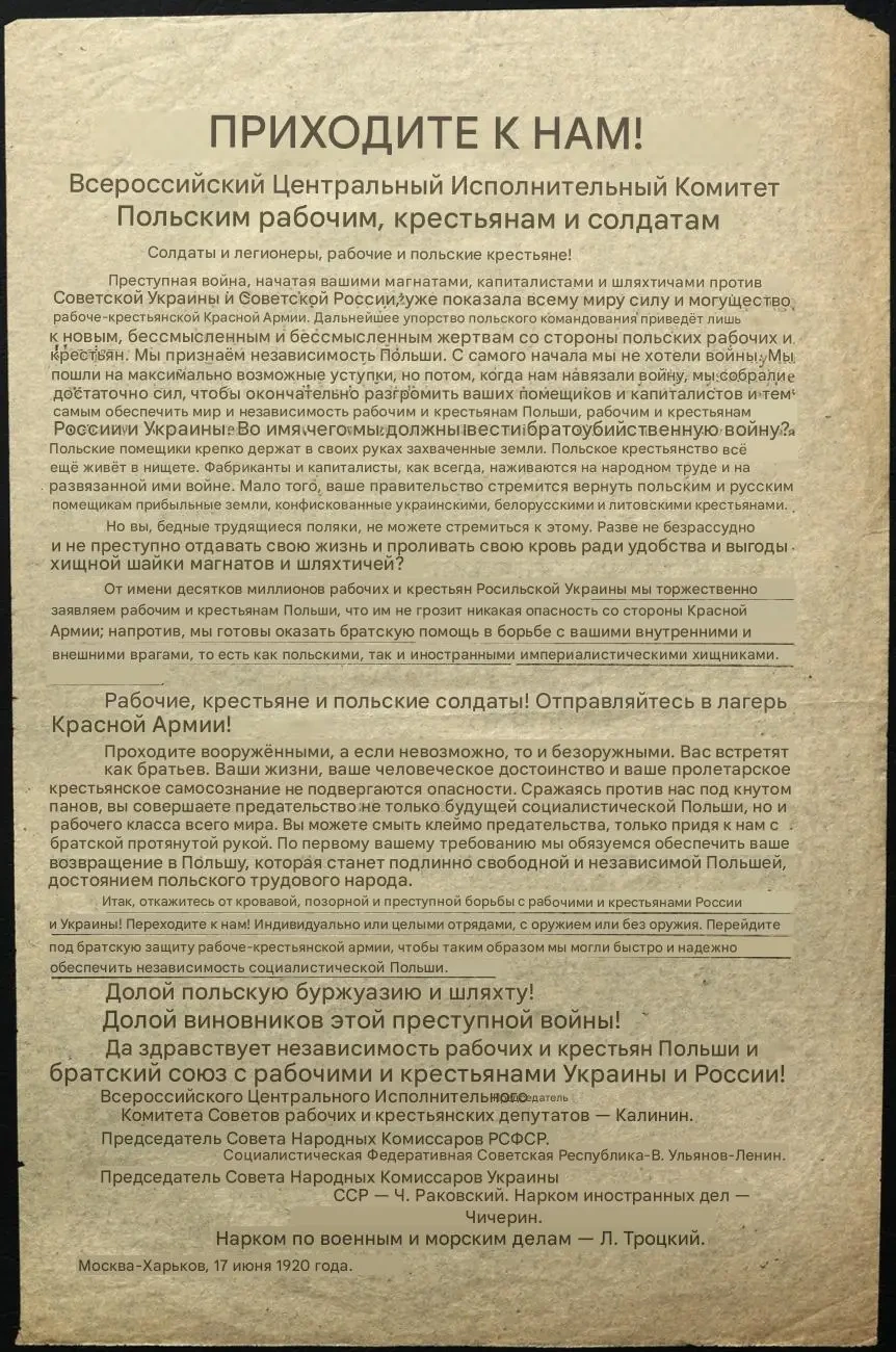 Листовка c обращением ВЦИК к польским рабочим, крестьянам и солдатам «Переходите к нам!». Архив РГАСПИ: КП-104049 ПМ-3375.