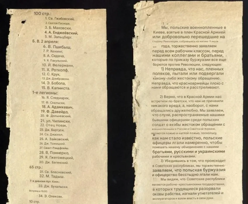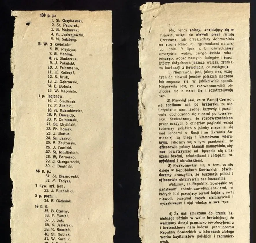 Фрагмент длинной листовки. С лицевой стороны написан текст от имени польских солдат, попавших в плен Красной Армии, о том, что с ними здесь хорошо обращаются. На обратной стороне листовки приведён длинный список имён пленных поляков с указанием военных частей, в которых они служили. От лица этих пленных и написана листовка. Фото из польского архива.