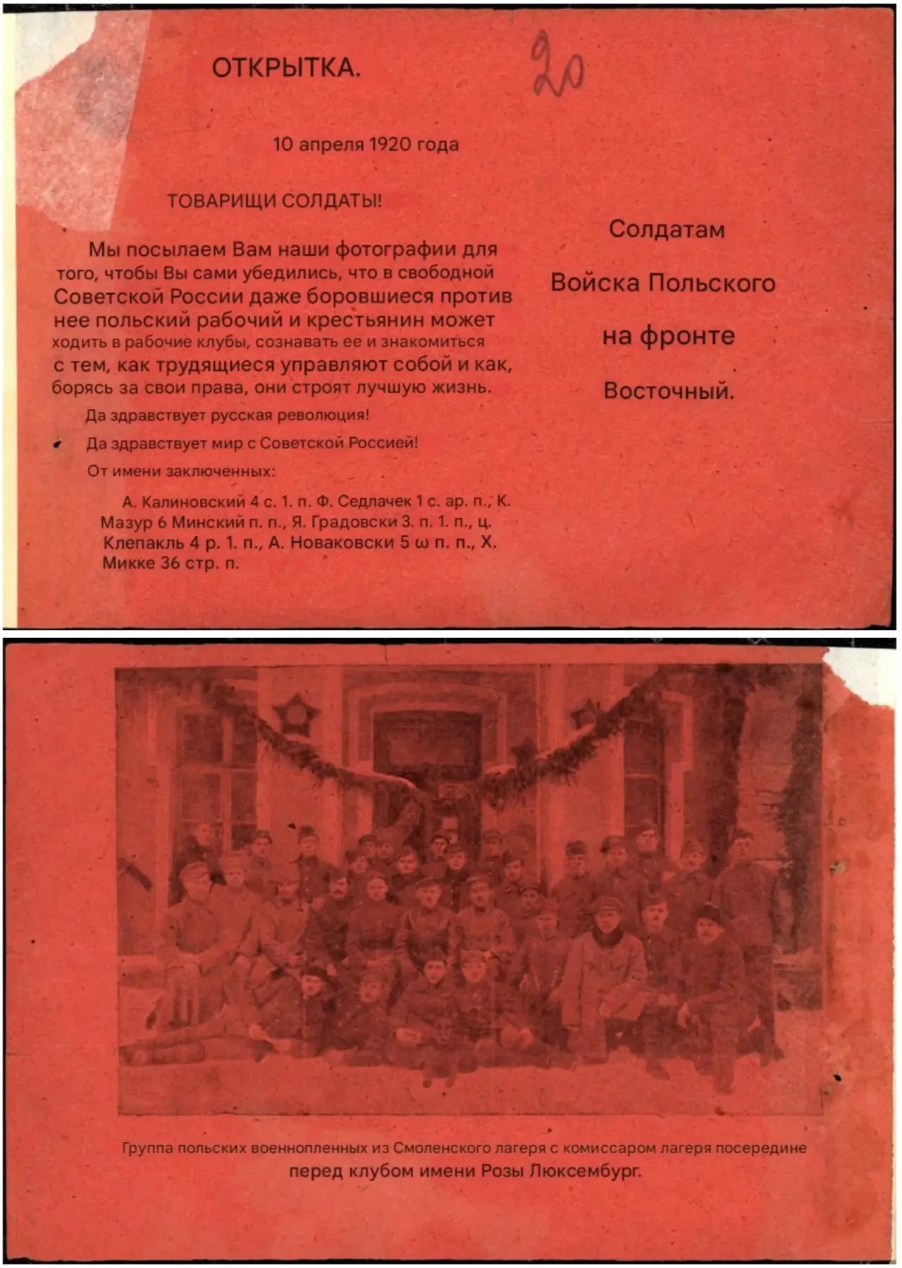 Листовка с обращением и фотографией польских солдат из советского лагеря военнопленных. Фотография служит подтверждением того, что пленные живы и их не расстреляли, как утверждает польская пропаганда. Красный цвет листовки выбран с целью её лучшей видимости на белом снегу зимой. Архив РГАСПИ: Ф. 104. Оп. 1. Д. 18. Л. 20–20.