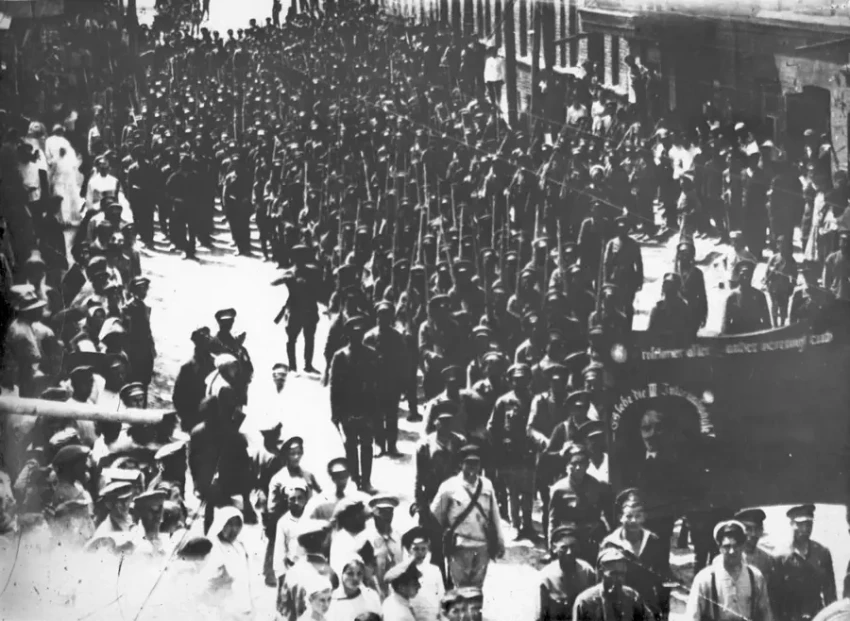 Части Красной армии на Театральной площади перед отправкой на Польский фронт. Архив РГАКФД: Ф. 788. Оп. 1. Д. 704. Л. 1.