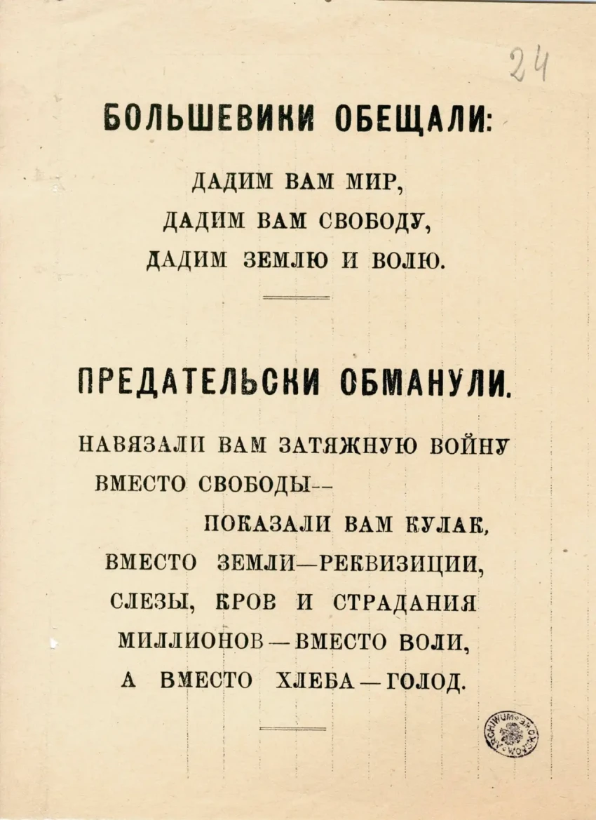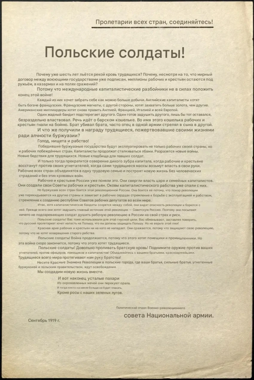 Листовка политотдела РВС N-ской армии с обращением к польским солдатам не принимать участия в войне, выгодной лишь капиталистам и панам. Архив РГАСПИ: КП-104049 ПМ-3429.