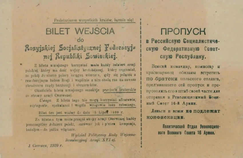 Листовка-пропуск с обращением к польским солдатам. Данный вид агитации использовался советскими войсками уже в 1919 году. Архив РГАСПИ: Ф. 104. Оп. 1. Д. 18. Л. 22–22.