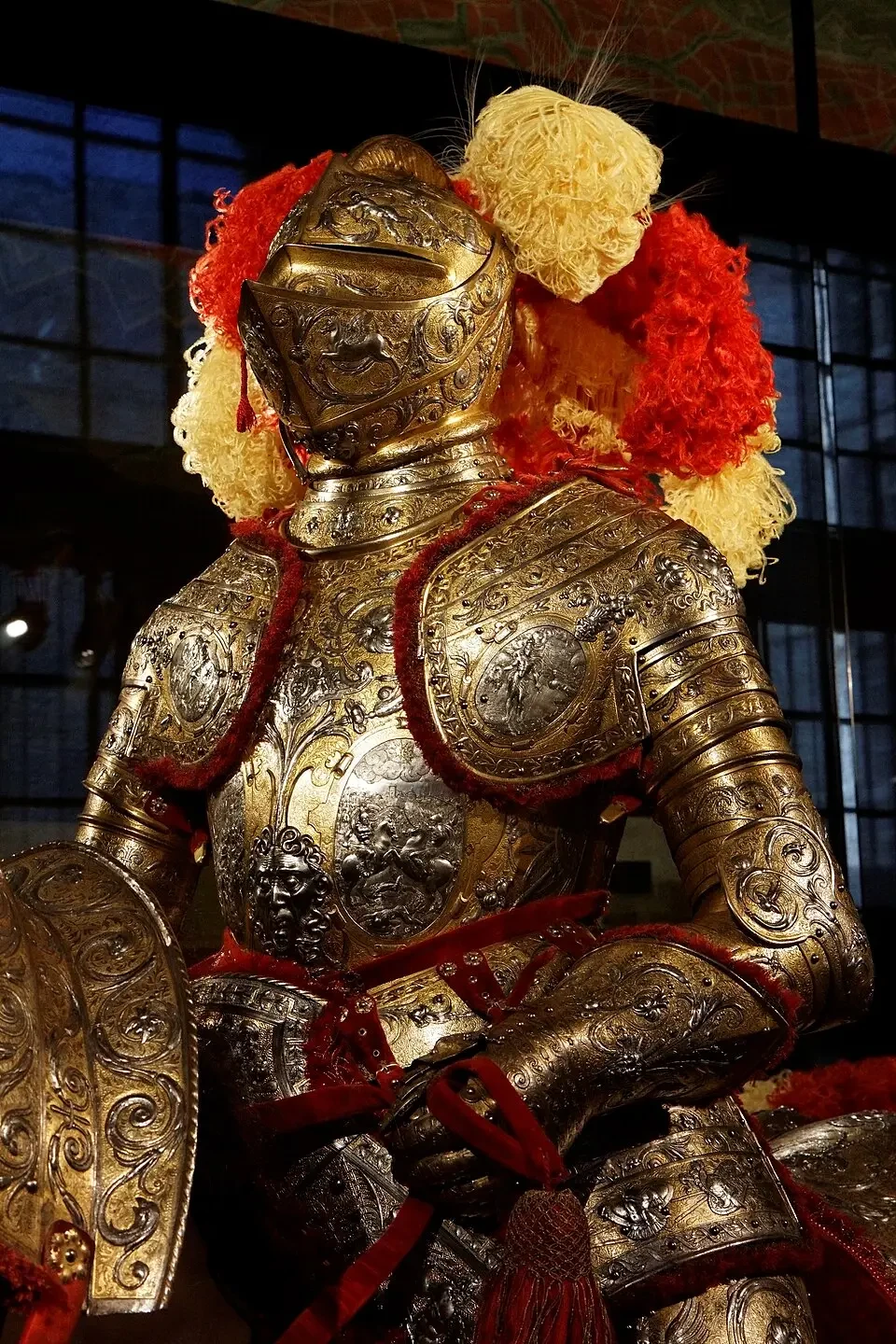 Этот же доспех. Вид сзади. На спине у кирасы и на наплечниках видны выполненные чеканкой изображения сцен из Троянской войны