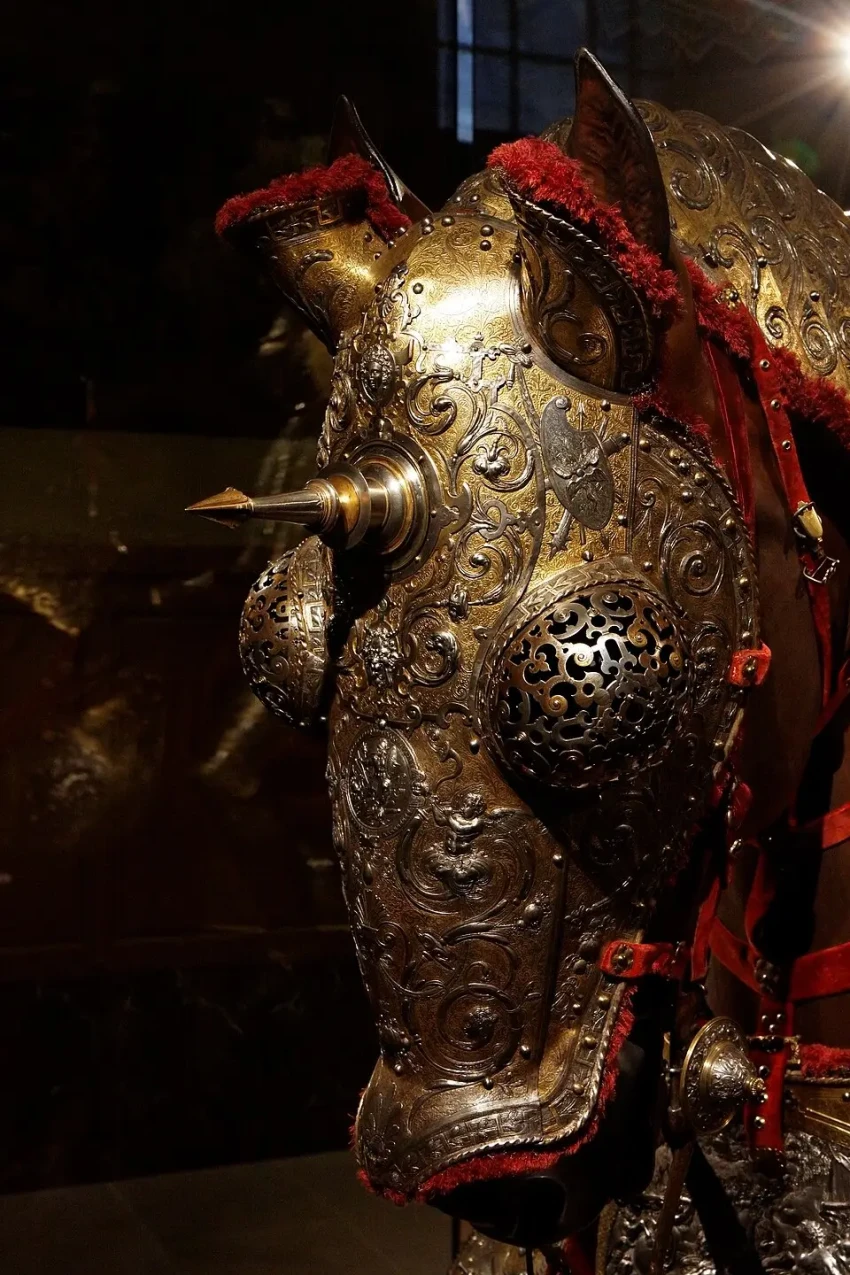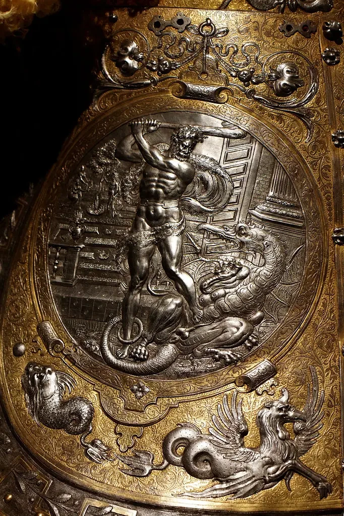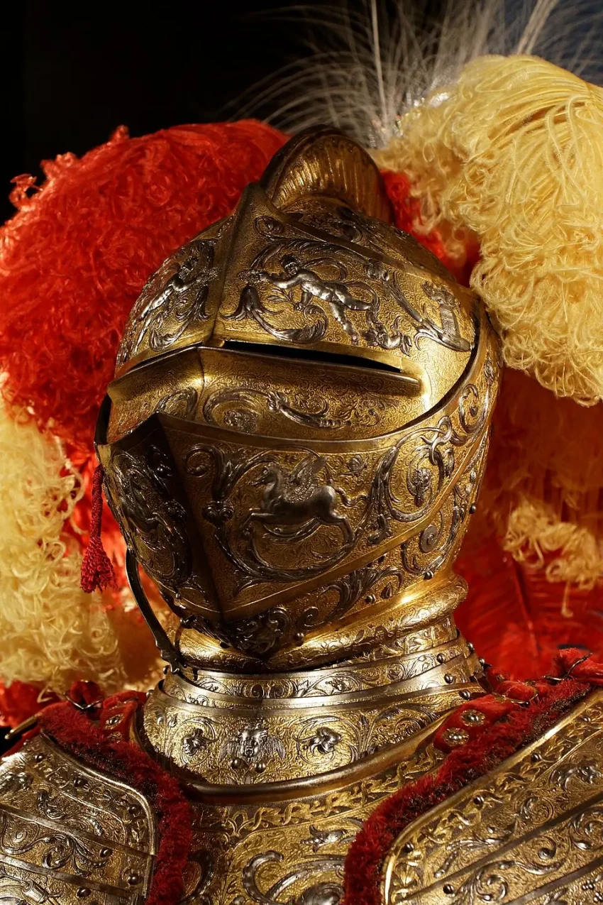 Доспехи эти представляют собой полный гарнитур, включающий и сам доспех для всадника, и абсолютно полный бард, то есть доспехи для коня. По сути дела, это даже и не доспех вовсе, а своего рода произведение доспешного ремесла и искусства: «чистейшей прелести чистейший образец» (А. С. Пушкин). Причем, несмотря на самое пышное оформление, какое только можно себе представить, отделаны они с таким вкусом, что в них нет ничего лишнего. Как об этом уже здесь сообщалось, доспех короля Эрика получил название «Доспеха Геракла», а все потому, что основными мотивами чеканных изображений на нем стали 12 подвигов Геракла, а также события из истории Троянской войны и плавания аргонавтов. Причем всю поверхность гарнитура украшает орнамент, и к тому же все его украшения либо позолочены, либо посеребрены. И очень важной деталью являются парные фигурки Пегаса, выбитые на забрале. Это не просто так, не просто фантазия мастера – это еще и «говорящий» символ красноречия владельца доспеха, в котором Эрик по задумке должен был предстать перед королевой-девственницей Елизаветой Английской.