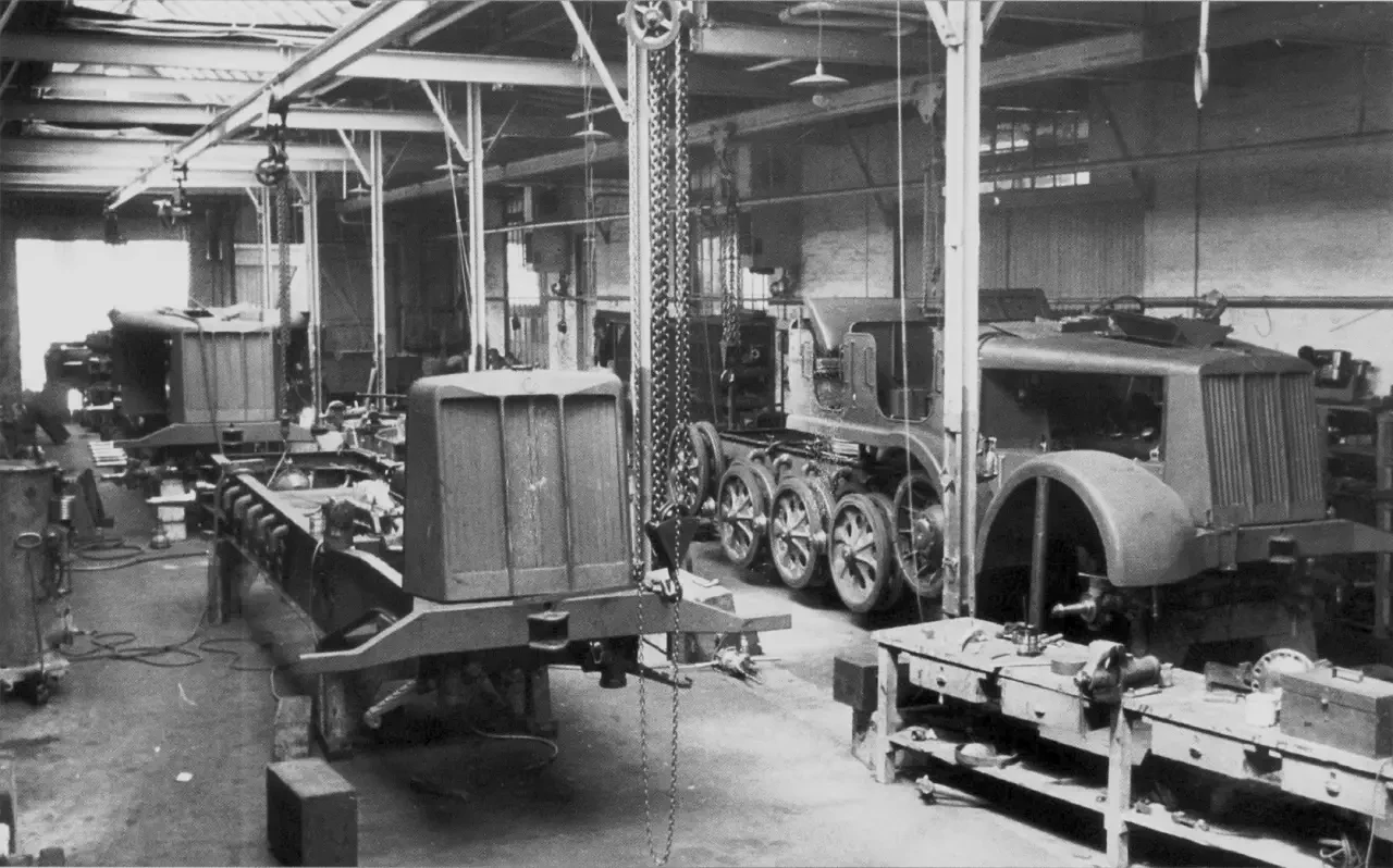 Сборка 18-тонных тягачей (Zgkw. 18t) на заводе VOMAG. Цех больше напоминает крупную автомастерскую, чем классический конвейер. Компания была известна своими грузовиками и автобусами, но из-за «плана Шелла» VOMAG была вынуждена ограничить производство лишь одной моделью грузовика и несколькими типами автобусов