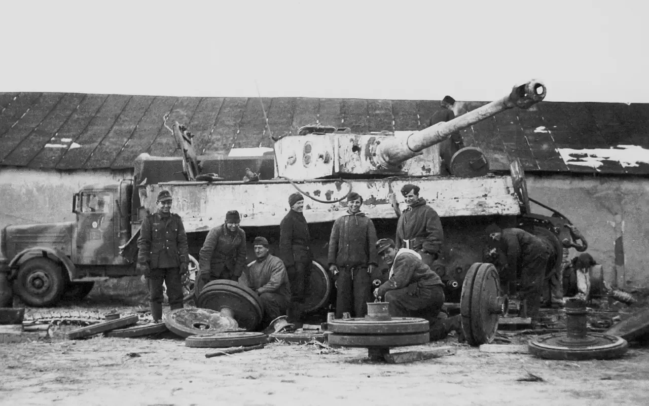 Улыбки снаружи, но проклятия внутри: бойцы ремонтного взвода или ремонтной роты наверняка клянут «шахматную» подвеску этого «Тигра» из 506-го тяжелого танкового батальона. Речь о знаменитой «шахматке» Книпкампа. Чтобы заменить один внутренний каток, механикам приходилось снимать несколько внешних. В полевых условиях, в грязи и на морозе, это был сущий ад