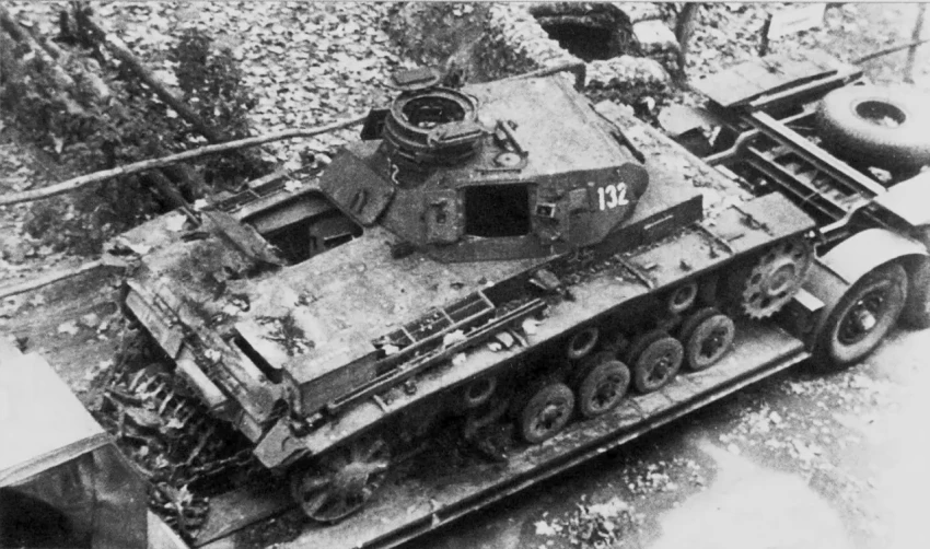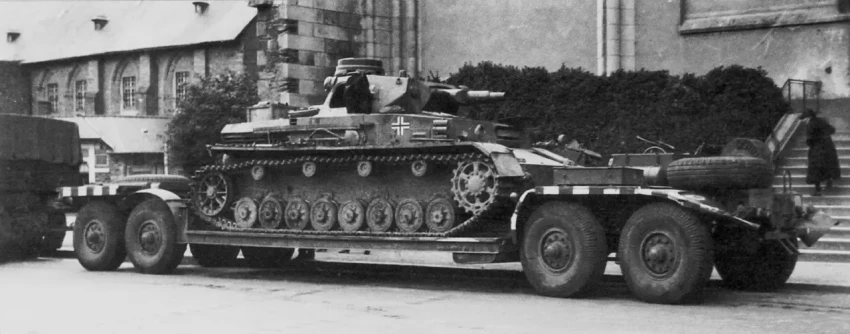 Основательно потрепанный Pz.Kpfw. III с демонтированной 37-мм пушкой (3,7 cm KwK L/46,5) на прицепе Sd.Ah. 116. Машина направляется в тыл