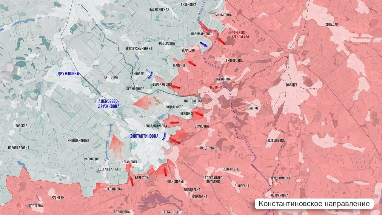 Развивая успех, наши штурмовые группы заходят в город с запада - со стороны освобождённого Берестка, давят в Ильиновке и Степановке. С востока продвигаются от Новодмитровки в районе улицы Минская, оказывая давление на Голубовку. Эта высота - ключ к полуохвату Константиновки с северо-востока. Если враг её потеряет, гарнизону придётся либо бежать, либо готовиться к ещё одному котлу.