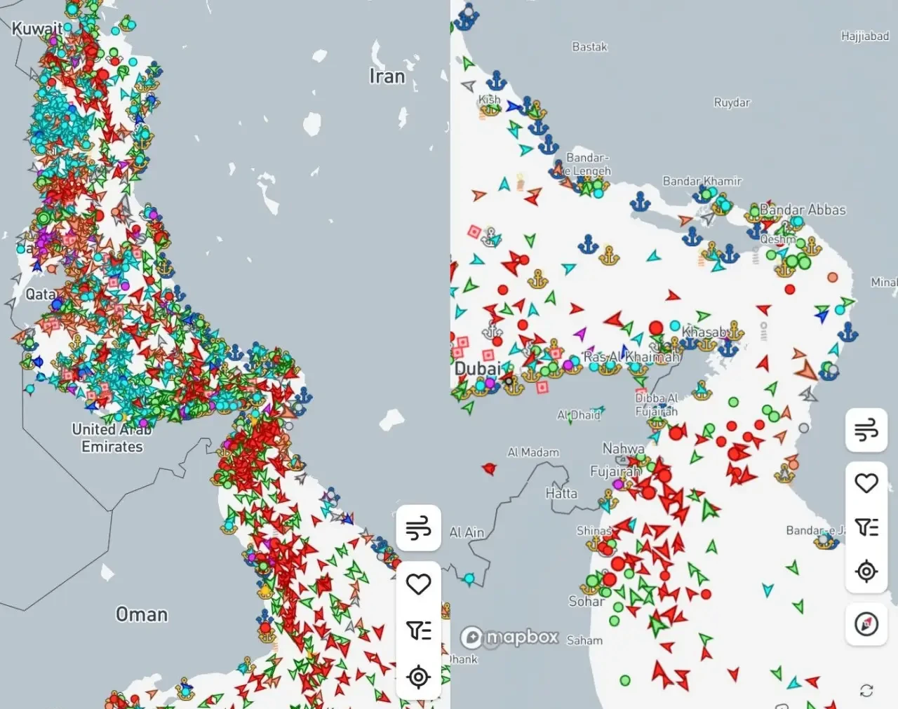 Трафик в Ормузском проливе в день атаки (слева) и двумя сутками позднее (справа)