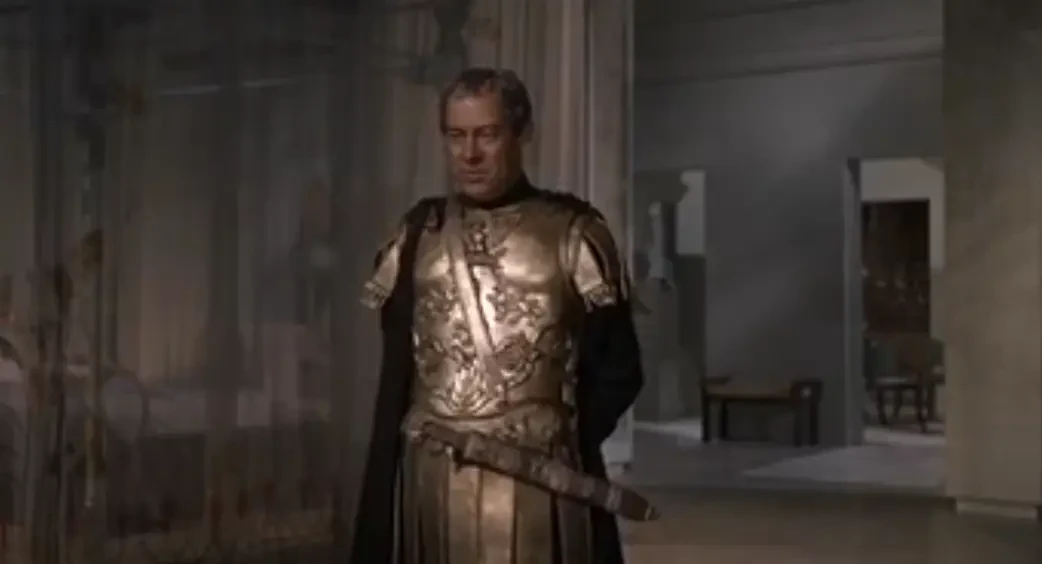 1.Пересмотрите старый, 1963 года выпуска, кинофильм «Клеопатра». Помимо сюжета это просто энциклопедия внешнего облика тогдашних римлян и египтян, а также воинского вооружения. Есть, правда одна труднообъяснимая неточность. Римские воины всех рангов в этом фильме носят мечи на поясе слева и почти что горизонтально. А надо – справа вертикально! И эта ошибка бросается в глаза. Но вот доспехи и шлемы воспроизведены с высоким уровнем достоверности. Кадр из кинофильма «Клеопатра». На нем Цезарь в кирасе с чеканными украшениями. Прямо-таки готовый образец для современного индийского доспешного производства…
