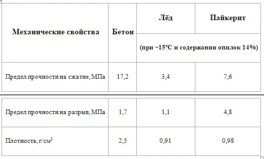Как и любая конструкция изо льда, пайкерит выглядел твёрдым, но фактически постепенно терял прочность. Характеризуясь определённой текучестью, он начинал медленно прогибаться под действием собственной массы, если не выдерживалась температура не менее −16 °C, необходимая для прекращения этого процесса.