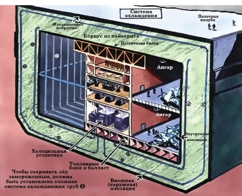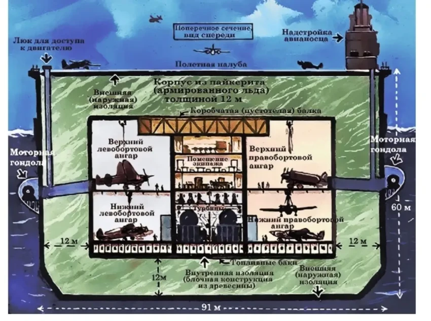 Во время Второй мировой войны появилось немало оригинальных и довольно фантастических проектов военной техники. Одним из них был ледяной авианосец “Habbakuk”.