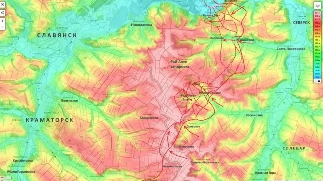 Вместе с этим очень сложная для украинских формирований ситуация складывается на Славянском направлении. Российская армия инициировала бои за село Каленики и вышла на подступы к Рай-Александровке, которую Юрий Подоляка характеризует как основной логистический узел и крупнейший укрепрайон ВСУ на данном участке. Прорыв здесь обеспечит выход на оперативный простор вплоть до Николаевки.
