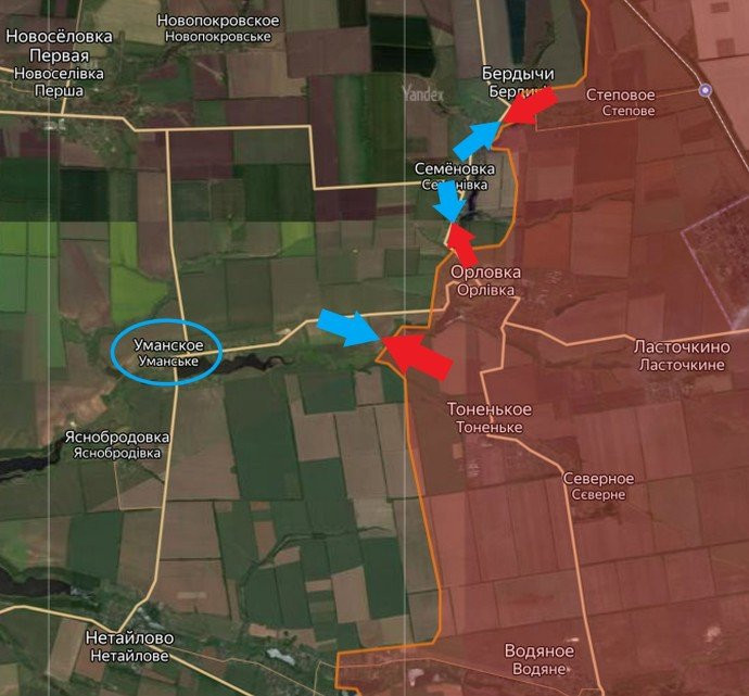 Также отмечены активные действия армии РФ по нанесению ударов по противнику, который находится в достаточно сильно укреплённом населённом пункте Уманское.