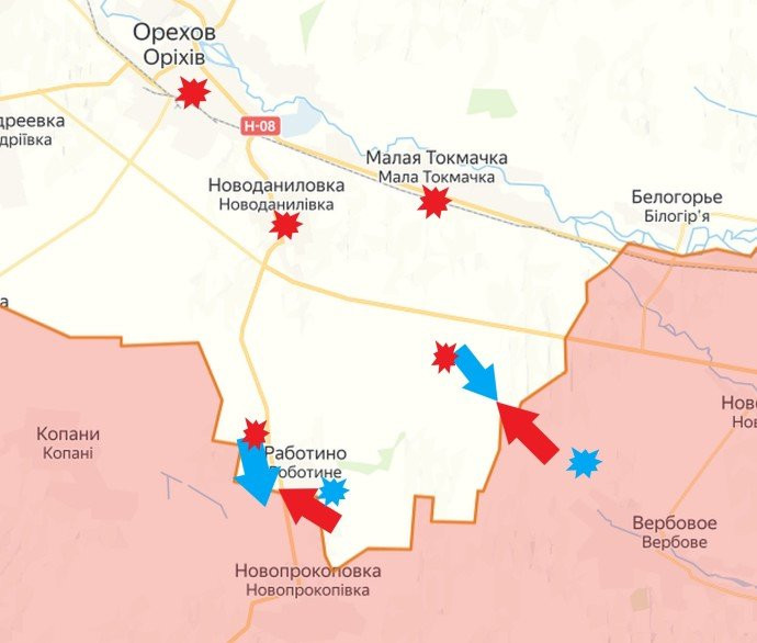 На Запорожском направлении продолжаются встречные бои с активным применением тяжёлой техники. ВС РФ активно используют десантные атаки и самоходные миномёты. Несмотря на сообщения о дефиците боеприпасов у ВСУ, обстрелы кассетными снарядами не прекращаются. Произошёл обстрел Запорожской АЭС, что вынудило объект перейти на аварийное питание. Ситуация остаётся напряжённой.