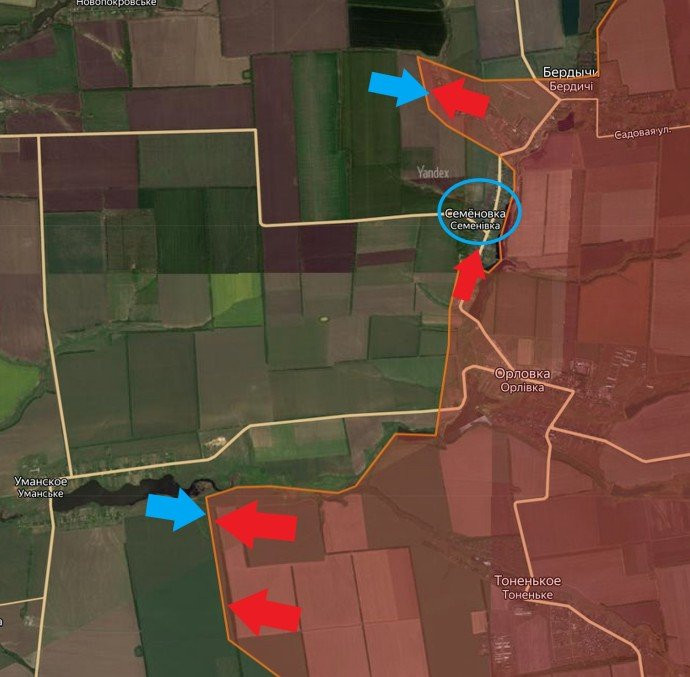 Что касается Семёновки, то здесь зафиксировано продвижение Вооружённых сил Российской Федерации (ВС РФ) в южной части. Из неофициальных данных следует, что армия РФ уже вошла в центральную часть этого населённого пункта.