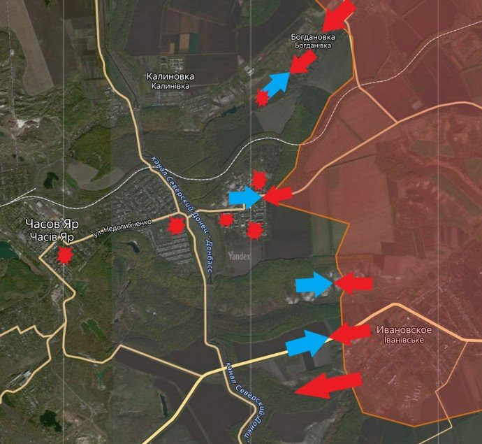 На Артемовском направлении ВС РФ начали штурм и вступили в бои на восточной окраине Часов Яра, особенно в районе улиц Горбатова и Зеленая, в рамках начала битвы за этот город. Одновременно, подразделения 11-й бригады ВДВ России проводят зачистку территорий восточнее канала Северский Донец-Донбасс, вытесняя остатки подразделений Вооруженных сил Украины (ВСУ).