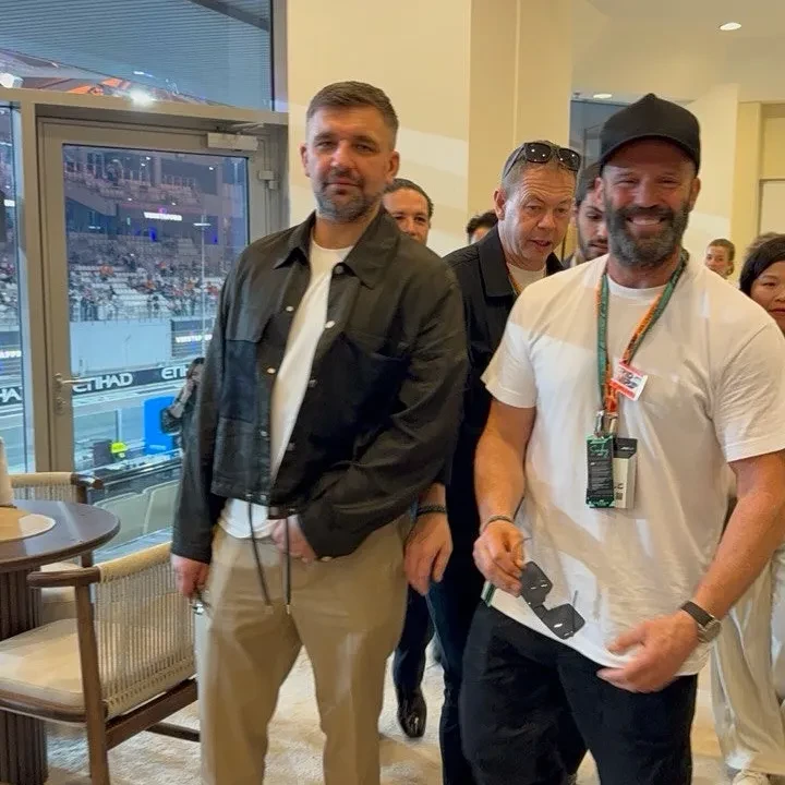 Джейсон Стэтхем с сыном, Баста с женой Еленой Вакуленко-Пинской, Оксана Самойлова и Эмили Ратаковски на Гран-при "Формулы-1"